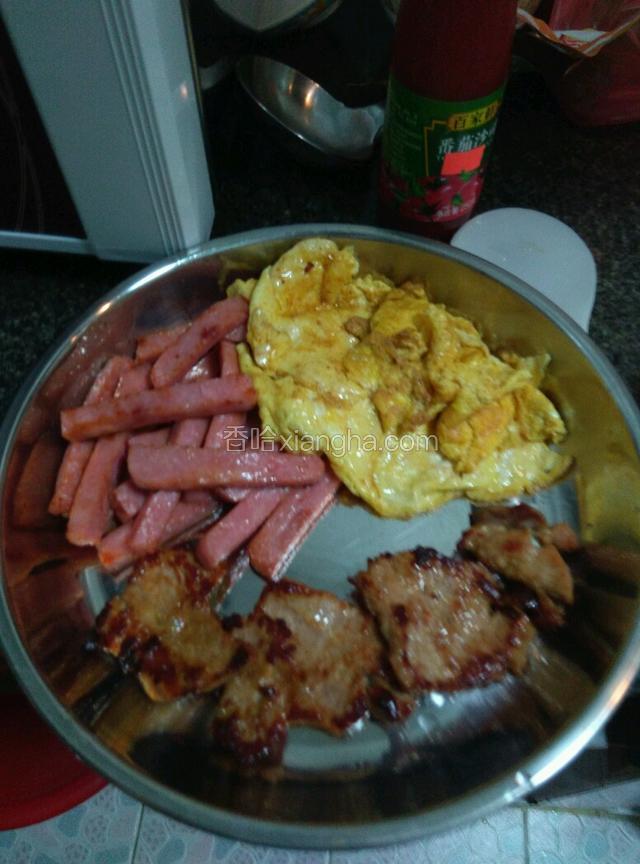 2.开始对猪扒油炸下(要确保熟哦),再对火腿过下油,最终到鸡蛋