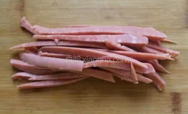 4.火腿肠切成细丝,细一点比较容易做出饼,要不太粗饼不好卷