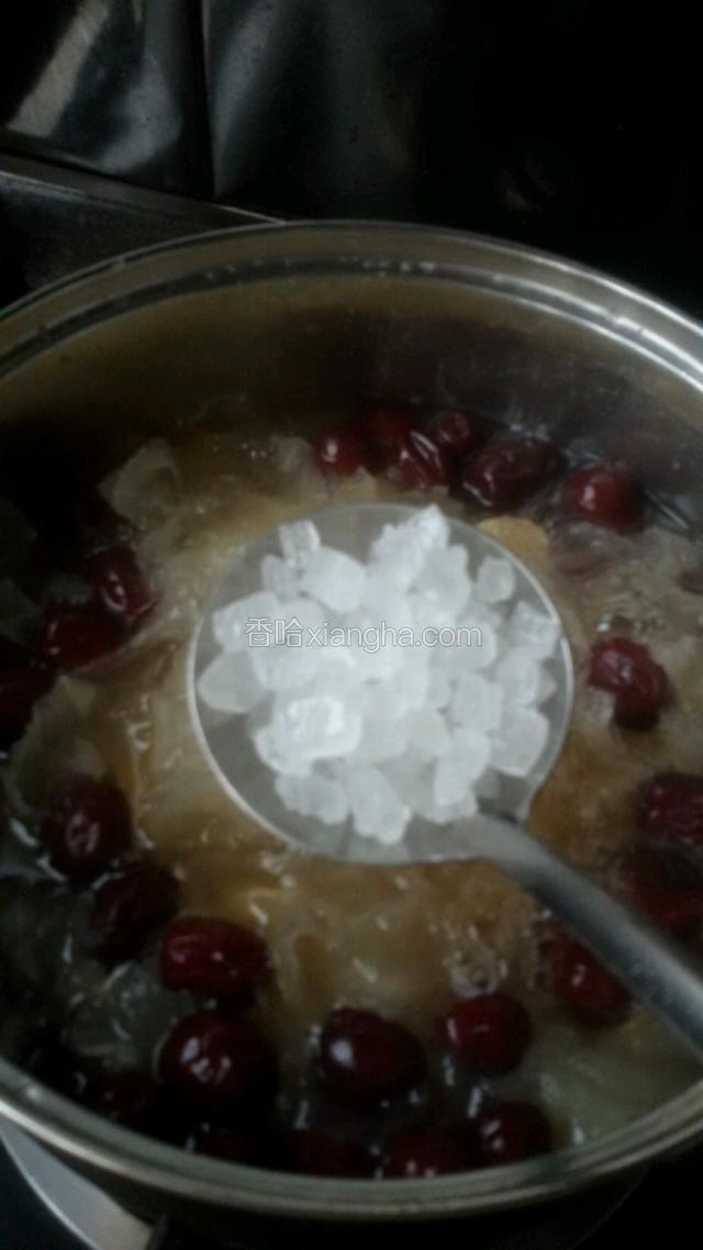 3.捞出一块莲子尝一下熟了时,在放适量冰糖继续煮制。