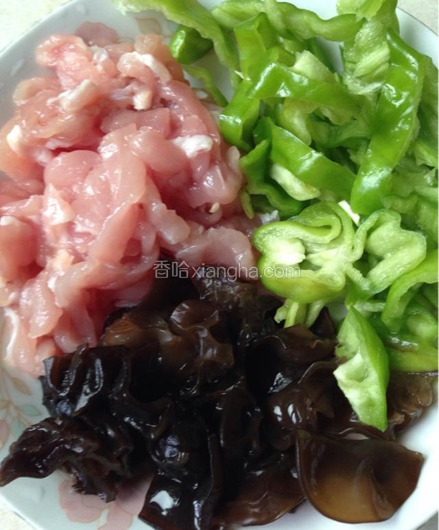 2.如图所示:准备辅助食材:肉丝,小片木耳,青椒丝