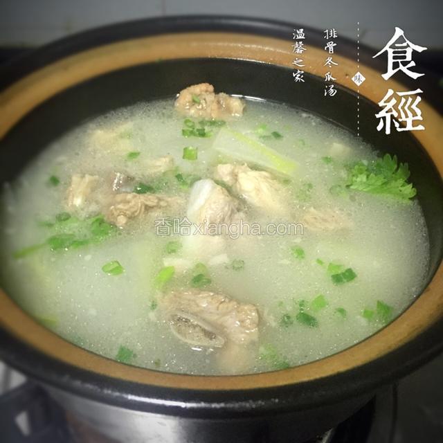 4.大火烧开后小火慢炖两小时捞出葱加入冬瓜,最个加一点盐和葱花,美味的冬瓜汤就做好了