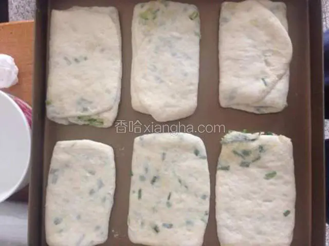 5.拍少许手粉。擀成长舌状。两边往中间对折。