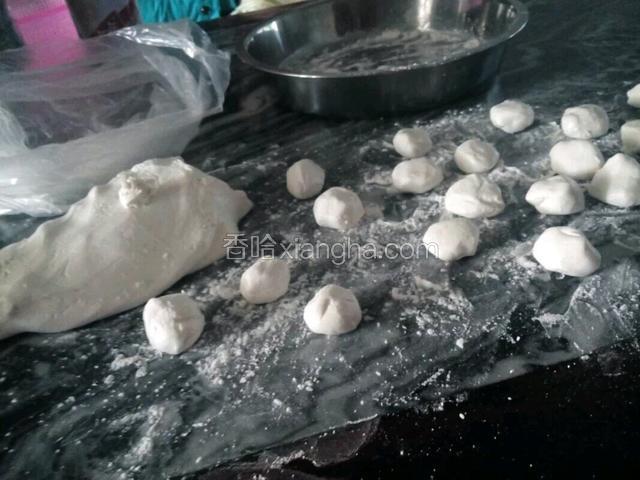 2.糯米粉准备好,先把一点糯米粉冷水下锅,开小火慢慢的把糯米粉搅成米糊型状。把弄好的熟米团放入干净的盆中然后再加入干粉搓成团。再分成小团团。