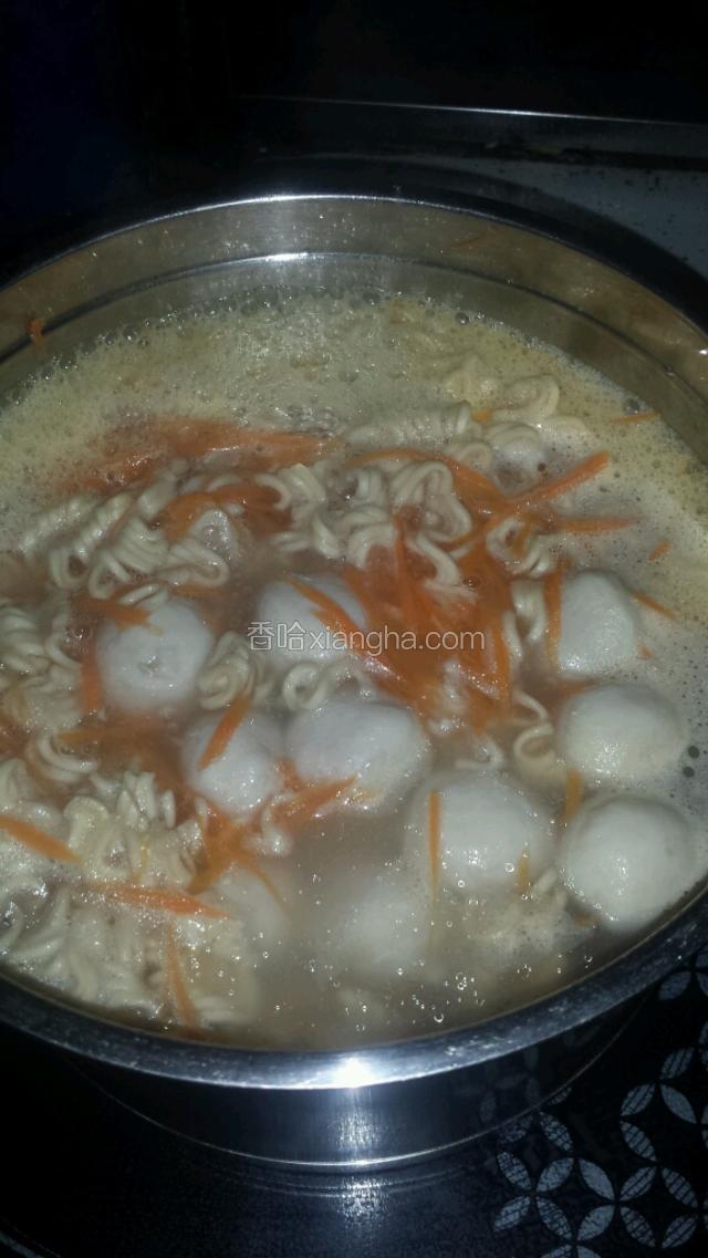 把压过的水倒入干面里面去煮,放入肉丸煮熟