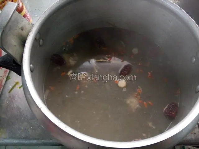 2.将材料倒入 加有开水的高压锅,开中火‘上气二十分钟后关火,打开盖子,调入盐、鸡汁,调好味