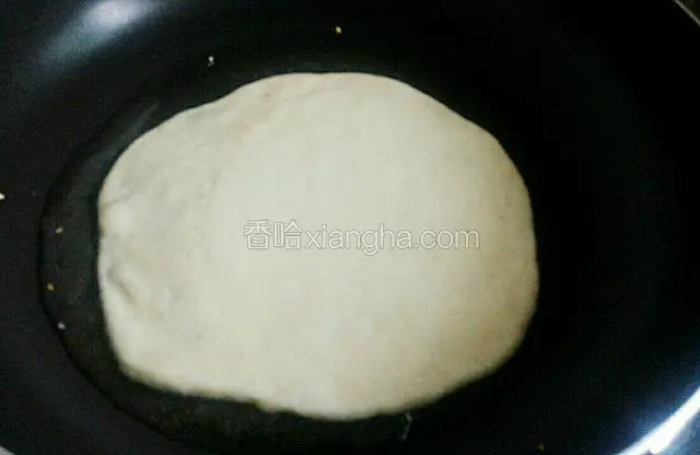 4.擀面杖擀成圆形(要擀的中间厚,边缘薄),放入一小勺冻藏过的猪油和一小勺椒盐,捏紧收口