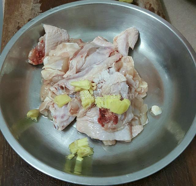 3.斩好的鸡块放盘子里;加生姜(拍扁切两刀不要太碎)少许盐米酒,抓均稍腌制一下。