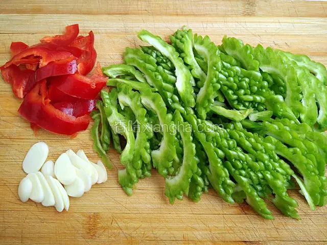 3.将苦瓜切斜薄片 红椒大蒜也切片备用