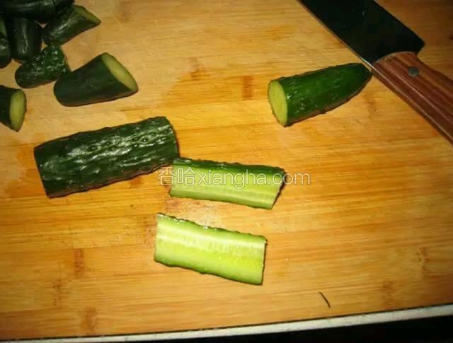 3.晾干的黄瓜切成段,再把每段切成条。如果还有残余的少许水分,用纸巾擦干