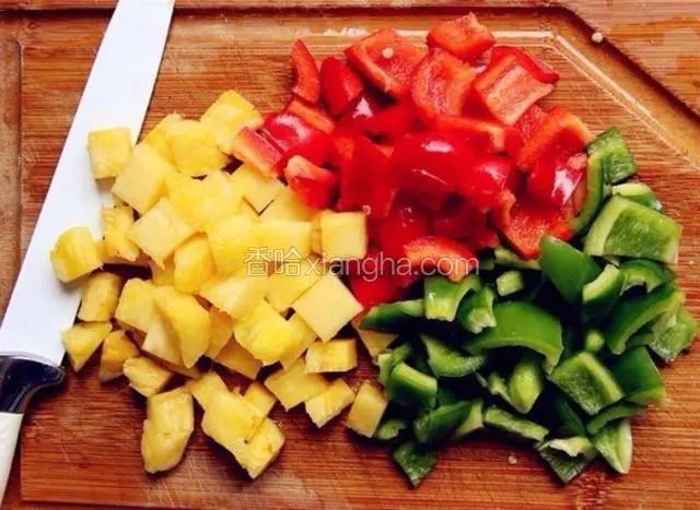 1.青红椒洗净去籽切成2cm左右的小块。菠萝也同样切成2cm的小块。