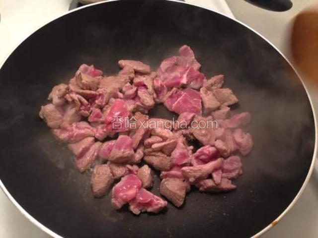 2.热锅,下入切好的羊肉片。不要放油,直接煸炒出肉的水分。