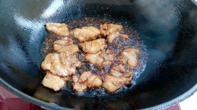 2.锅中放适量油,放入五花肉煸炒至断生。