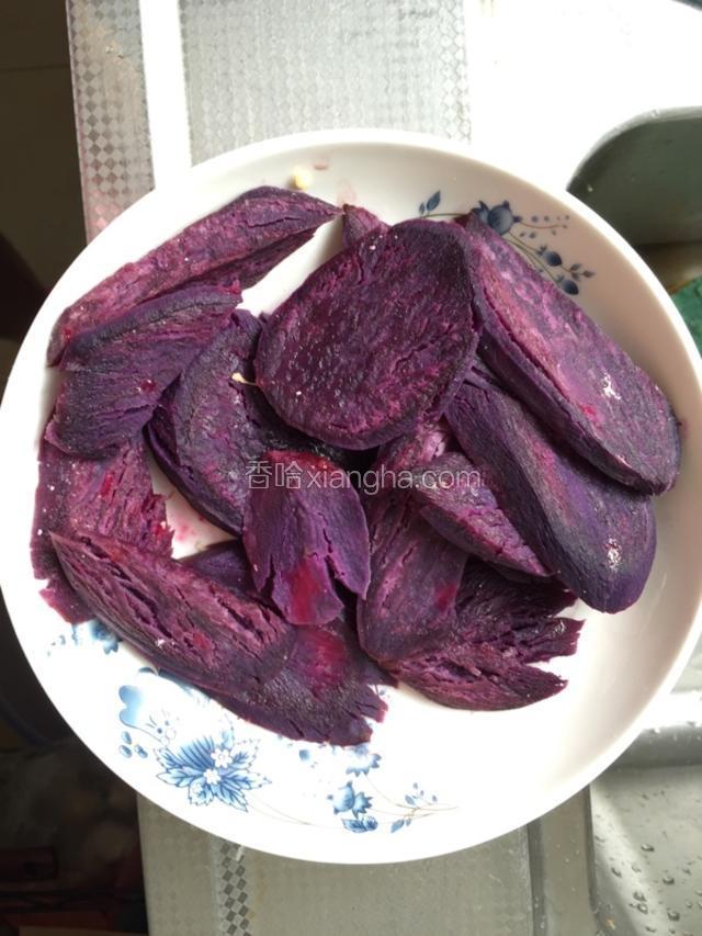2.紫薯加入糖和少许温水,搅成糊状,待用。