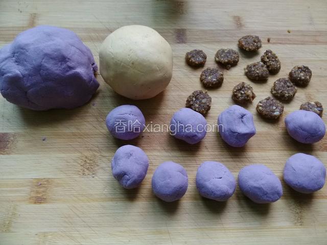 4.分别加入糯米粉,分13 g小剂,馅4g左右