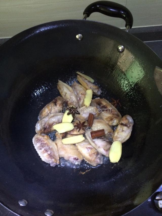 6.两面都要煎至微黃,方便上色。中途放入姜片,八角,桂皮一起煎。