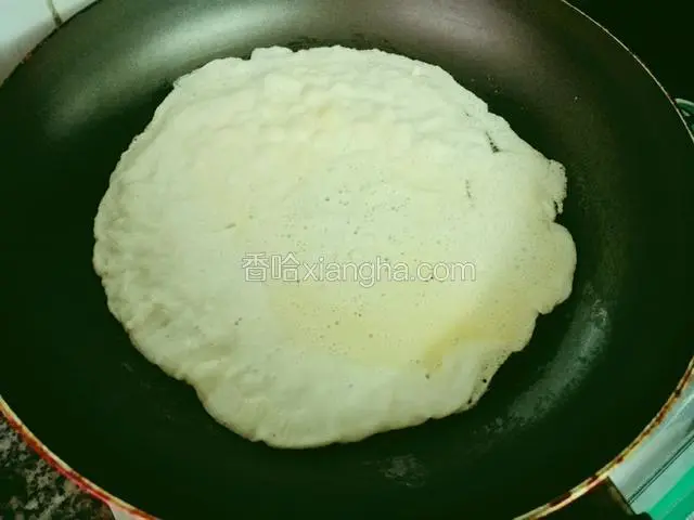 5.平底锅预热放入适量花生油,把一半鸡蛋液倒入摊 平,煎得黄了取出来