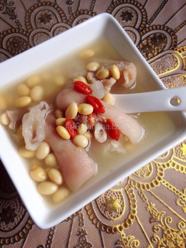 5.砂锅中放入猪蹄、黄豆和生姜,一次性加入清水。