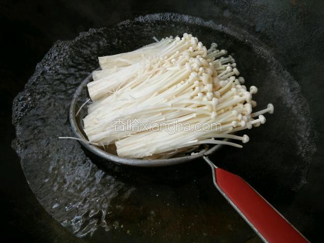 6.锅里烧开水,分别倒入金针菇及小白菜过一下开水,金针菇易熟,要快,一分钟不到即可,小白菜两分钟即可!