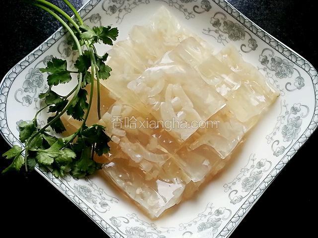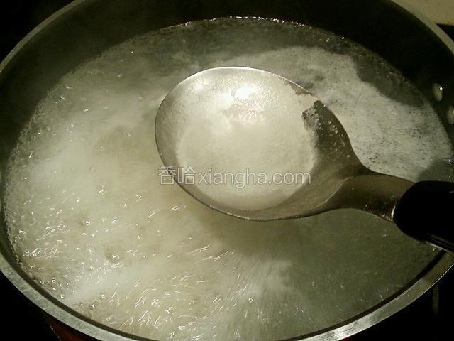 5.锅里换水,烧开后将猪皮放入,看到猪皮已经是半透明的了吧。煮十分钟将猪皮再次用温水洗净