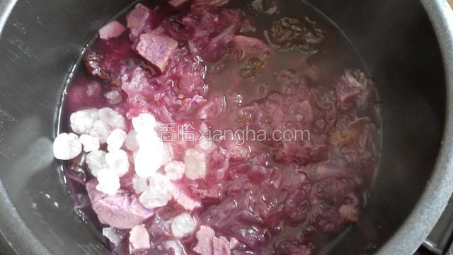 5.把银耳,紫薯,红枣放电锅里,加适量的水加热40分钟
