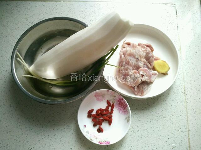 1.备好图中食材。羊肉,白萝卜,枸杞,姜,葱。
