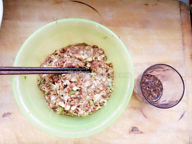 2.葱放入羊肉馅拌匀后,在加入花椒水打上劲备用