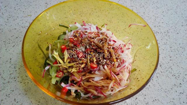 5.把莴笋,红萝卜挤干水放在海带一起。