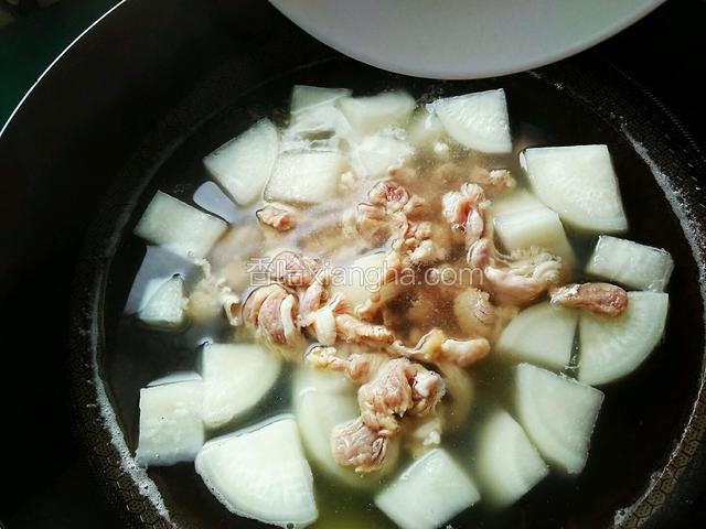 3.焯水后的羊肉放清水里再浸泡一会,去处更彻底。白萝卜去皮改刀切成小块。生姜切片。香葱切小段。
