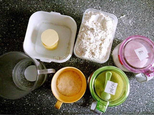 1.准备食材,分类称重,黄油室温软化,用手按压凹就行