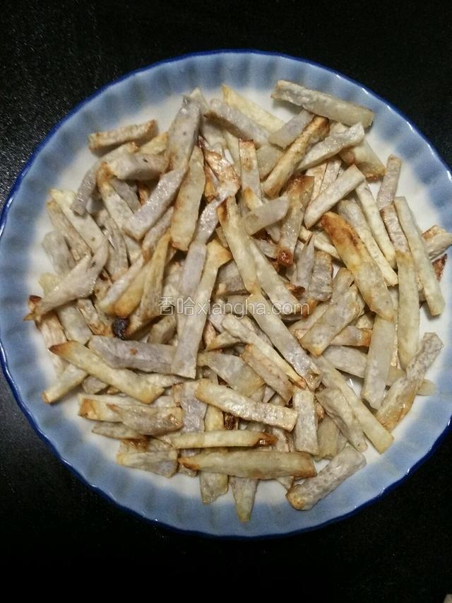 2.把切好的条形的香芋拌一点点生粉和油,放入电炸锅内200度正反两面各10分钟。