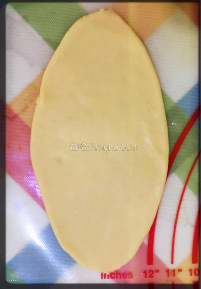 6.取一份油皮按扁,包一个油酥;
