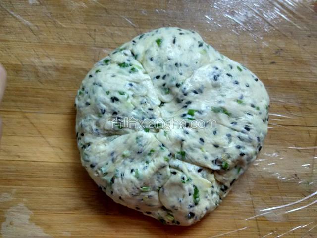 4.搅拌均匀再加一点温水和成面团,加水一定要一点一点加,能和成面团就可以,放多水面团就有点软了,到后边擀片不好擀。放一边饧20分钟。