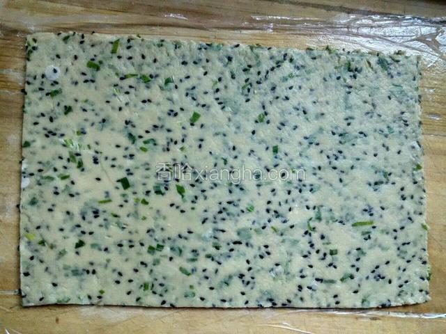 6.我是在案板上铺了一层保鲜膜,在上面把水油面按成片,把酥油面放中间。