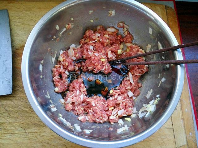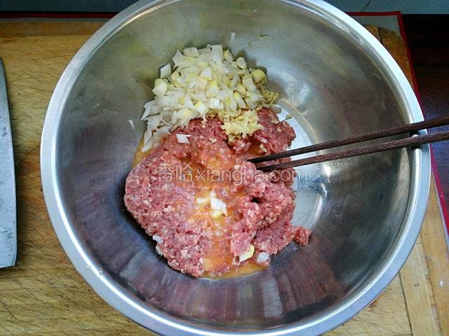 2.把蛋液,葱,姜末放入羊肉馅中搅拌均匀
