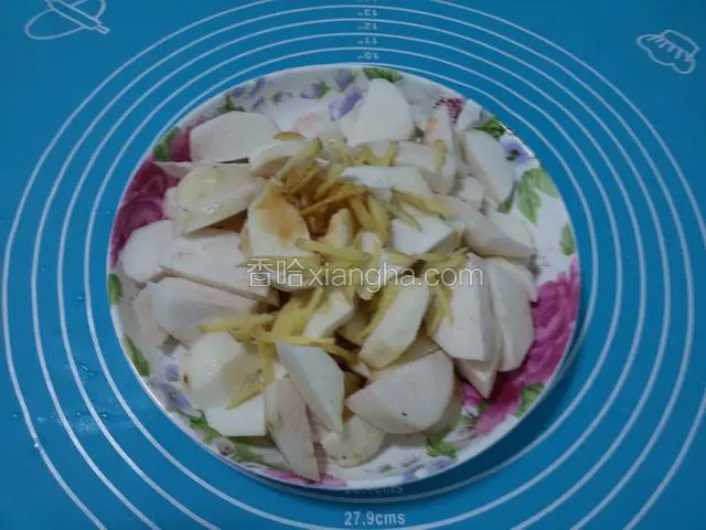 3.芋头放适量盐,放入姜丝,放适量生抽抓匀腌制十分钟