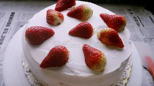 5.蛋糕胚整个涂抹奶油用刮刀抹平,表面任意放上切开的草莓!