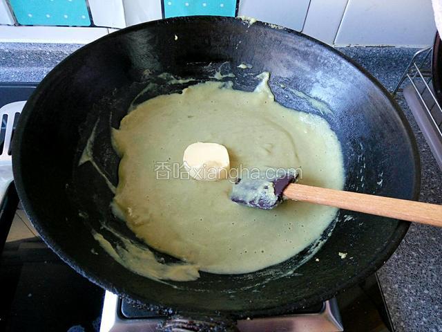 6.放入炒锅中,小火炒冒泡添加黄油,用铲子不停搅动,黄油化开