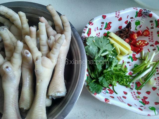 2.鸡爪焯水后洗净剪掉指甲,姜切片,葱切成葱段和葱末,香菜切成段,小米椒切成颗粒