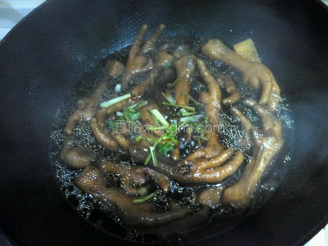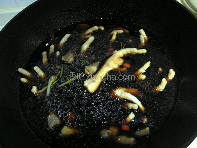 5.水里加料酒,冰糖,盐,老抽,再放入鸡爪