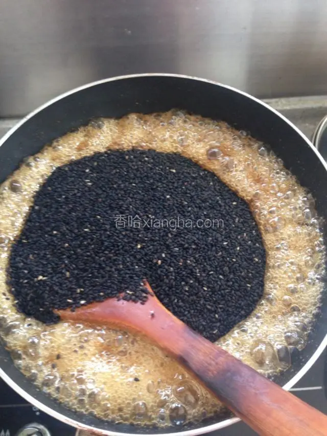 4.当糖汁呈琥珀色时倒入所有黑芝麻,关火,快速翻炒均匀。