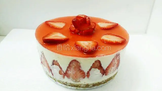 4.倒入一小 部分慕斯液,把蛋糕底放入,上面放一些草莓,芒果丁,再把剩下的慕斯液倒入,震动几下,让慕斯液均匀,放入冷藏五个小时