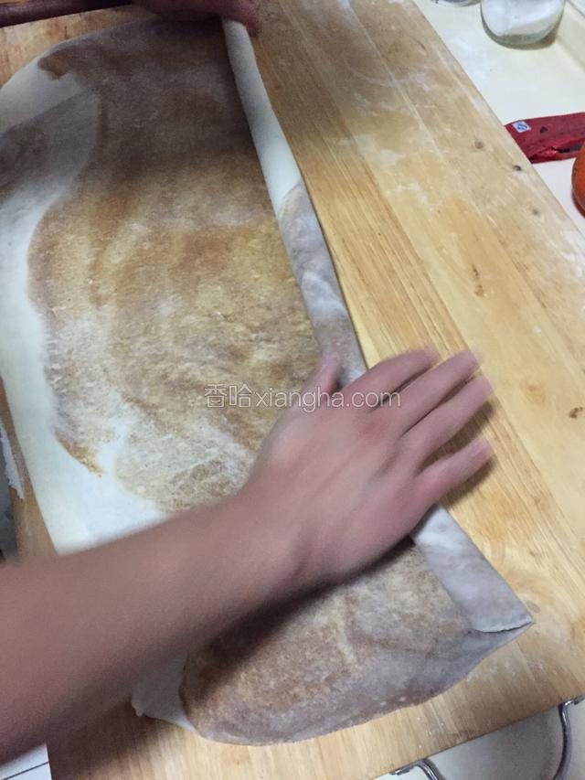 6.醒发好的面团擀成薄的大圆饼。涂抹芝麻酱。
