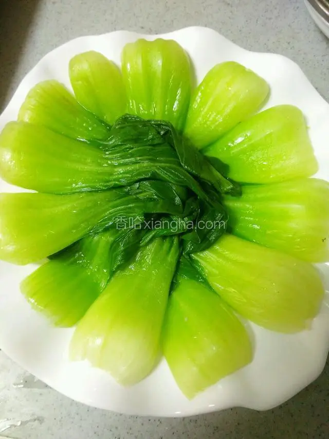 5.锅内加入水烧开后,放入油菜烫一下出锅放入凉水中,不容易变色,同时加入一点点的盐。