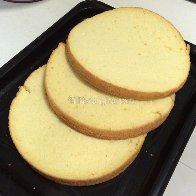 6.用抹刀抹上奶油,然后披上第二片蛋糕胚,以此类推,直至三片蛋糕胚都铺上抹平。