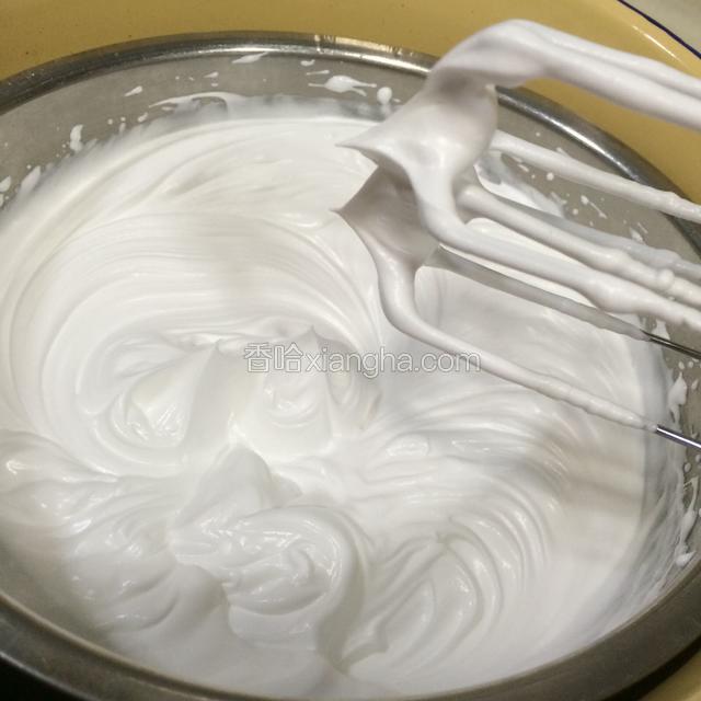 4.用电动打蛋器打发,打到有明显纹理,打蛋器提起有小尖头,不下垂。