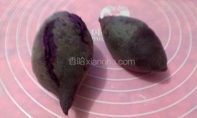 5.去皮,碾压成泥,放适量蜂蜜活匀,做好的紫薯蜂蜜不能太软,软了不好包。