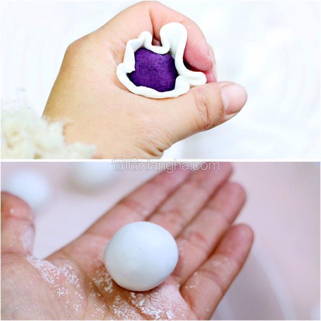 5.紫薯馅分成8克左右,搓成小团备用。