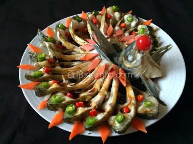 3.腌制好的武昌鱼在铺好葱花姜丝的盘子上一片一片鱼肉分开,排出孔雀开屏的造型,鱼头从下颌处劈开,不要断,立于鱼身,尾巴稍微处理挨着鱼头码好