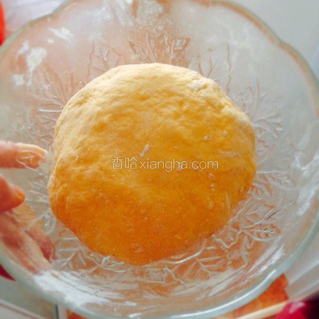 3.面粉里加酵母,倒入压好的南瓜泥