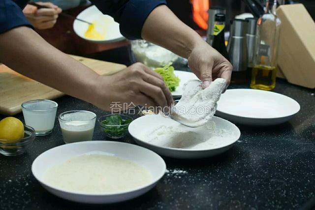 5.过三关 将鱼排依次裹上面粉、蛋液、面包糠。过三关的意思就是依次裹上这三种食材。